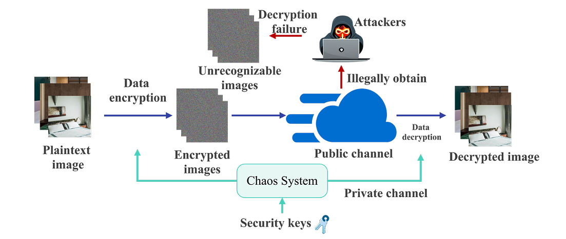 Chaotic privacy image encryption, on the other hand, utilizes cipher streams generated by chaotic systems for use in image encryption constructs to increase the cracking cost of the algorithms by using high randomness to ensure that the privacy information of the image is protected. We are committed to designing chaotic systems and encryption constructs with better performance to improve the security of private information and build a trusted and secure communication environment.