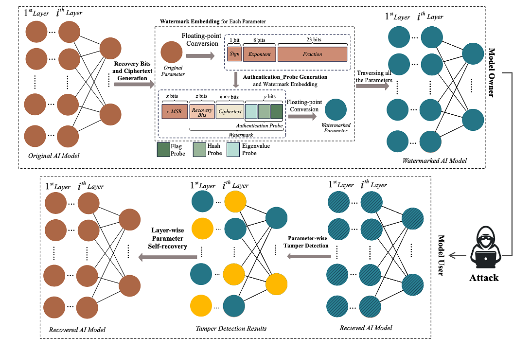 Abstract: Artificial Intelligence (AI) models are valuable and frequently face malicious tampering attacks, which require significant data and time to retrain when compromised. To address this issue, we propose a Guarded High-fidelity Compression-based Watermarking (GHCW) scheme for detecting and further recovering the tampered parameters, aiming to protect the model’s functional performance without the necessity for retraining. In GHCW, the watermark consists of an authentication probe for tamper detection, recovery bits, and ciphertext for model recovery. The authentication probe is generated by computing inherent characteristics of the parameters using hash algorithms and eigenvalue calculations. Different from existing works, the recovery bits are produced through a high-fidelity model compression technique, which concentrates key model information into fewer high-priority bits. This design enables the recovery mechanism to remain effective even under large-scale parameter tampering. To protect these bits, they are linearly encrypted with a key, generating a ciphertext that serves as a guard. To the best of our knowledge, we are one of the first to propose and implement this idea in the area of AI model protection. Experimental results demonstrate that GHCW excels in recovering models from tampering, especially large-scale parameter disturbance. Compared to existing methods, GHCW shows superiority in both model recovery and tolerance to tampering rate, tolerating tampering rates up to 70%, while existing methods recover at most 50%.