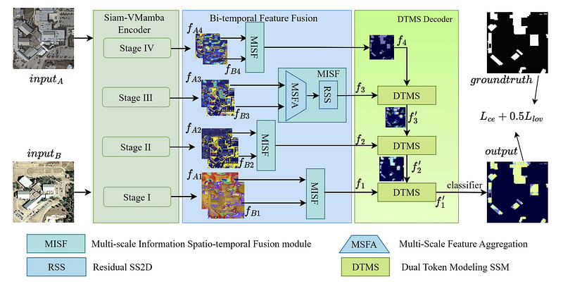 Abstract: Land cover change detection (LCCD) is a crucial research topic for rational planning of land use and facilitation of sustainable land resource growth. However, due to the complexity of LCCD tasks, integrating global and local features and fusing contextual information from remote sensing features are essential. Recently, with the advent of Mamba, which maintains linear time complexity and high efficiency in processing long-range data, it offers a new solution to address feature-fusion challenges in LCCD. Therefore, a novel visual state space model (SSM) for Land Cover Change Detection (LCCDMamba) is proposed, which uses Siam-VMamba as a backbone to extract multidimensional land cover features. To fuse the change information across difference temporal, multiscale information spatio-temporal fusion (MISF) module is designed to aggregate difference information from bitemporal features. The proposed MISF comprises multi-scale feature aggregation (MSFA), which utilizes strip convolution to aggregate multiscale local change information of bitemporal land cover features, and residual with SS2D (RSS) which employs residual structure with SS2D to capture global feature differences of bitemporal land cover features. To enhance the correlation of change features across different dimensions, in the decoder, we design a dual token modeling SSM (DTMS) through two token modeling approaches. This preserves high-dimensional semantic features and thus ensures that the multiscale change information across various dimensions will not be lost during feature restoration. Experiments have been conducted on WHU-CD, LEVIR-CD, and GVLM datasets, and the results demonstrate that LCCDMamba achieves F1 scores of 94.18%, 91.68%, and 87.14%, respectively, outperforming all the models compared.
