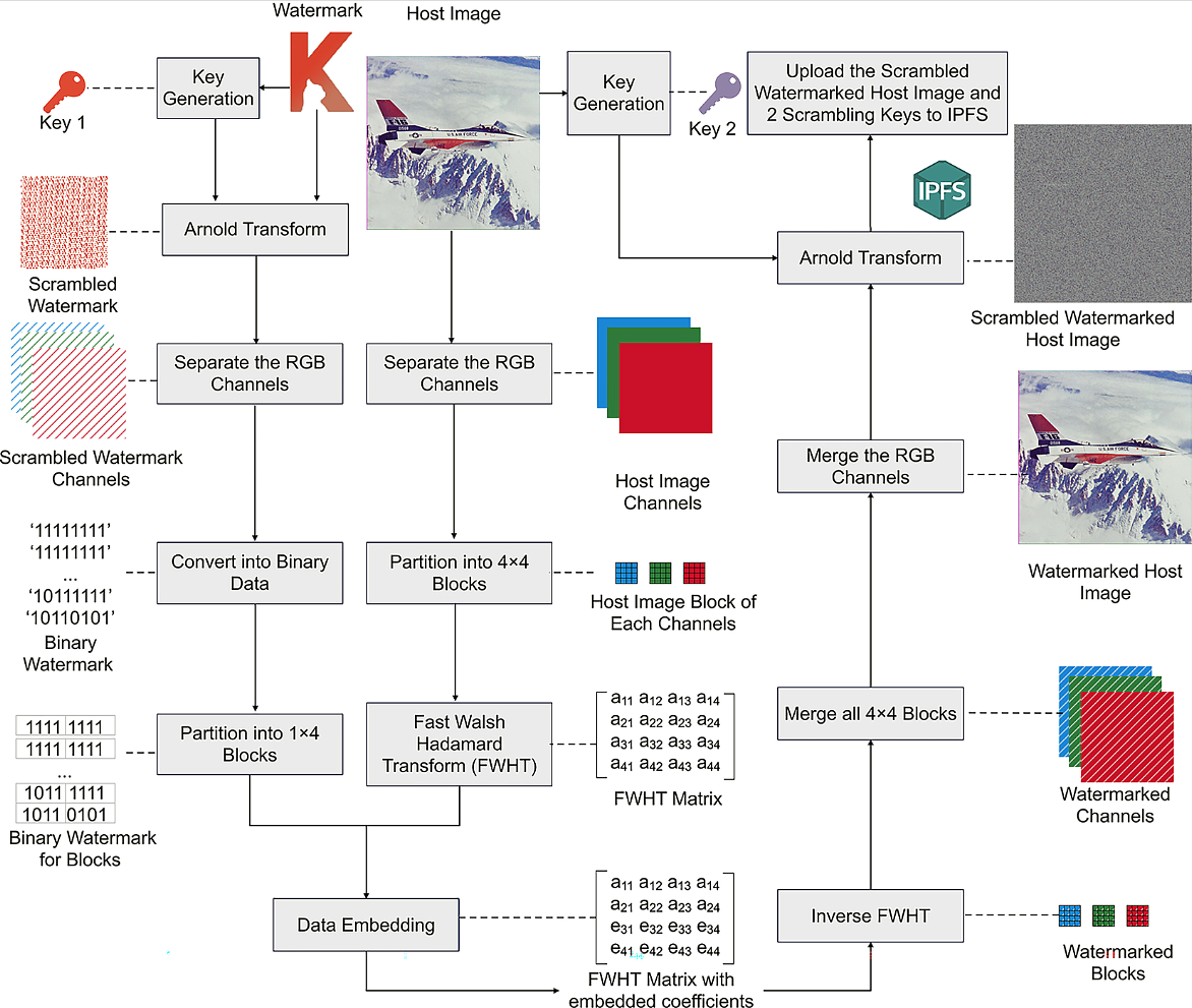 A novel blockchain-watermarking mechanism utilizing interplanetary file system and fast walsh hadamard transform