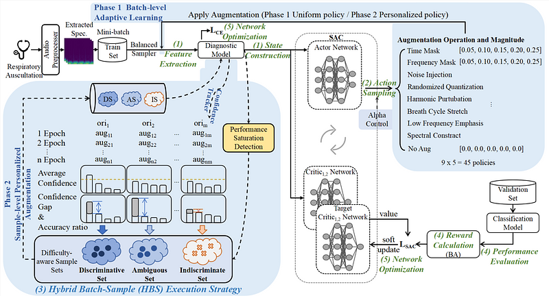 Abstract:Automated auscultation advances the detection of respiratory diseases, especially in areas with limited resources where traditional diagnostic methods are unavailable. On the other hand, the scarcity of auscultation datasets limits the automation performance, prompting the needs for data augmentation methods. However, most of the existing methods neglect the difference in acoustic sounds that requires personalized augmentation strategies. To address this, we propose a Progressive-Adaptive Spectral Augmentation (PASA), which is one of the first paradigms to adaptively select the best augmentation strategy for each sample. The PASA innovatively treats augmentation selection problem as a Markov Decision Process (MDP), creating an alternating loop between the diagnostic model and the augmentation selection. The agent selects the optimal augmentation operations and magnitudes via a task-specific design, including state construction, action sampling, Hybrid Batch-Sample (HBS) strategy execution, and reward guidance. The HBS strategy initially applies uniform augmentation across mini-batches while collecting sample-specific performance statistics. When model performance stabilizes, it transits to sample-level augmentation based on accumulated difficulty assessments. This two-phase design balances computational complexity with personalization. Extensive experiments across three benchmark datasets demonstrate that the PASA outperforms the state-of-the-art methods, pioneering a transformative paradigm for adaptive data augmentation in automated auscultation.