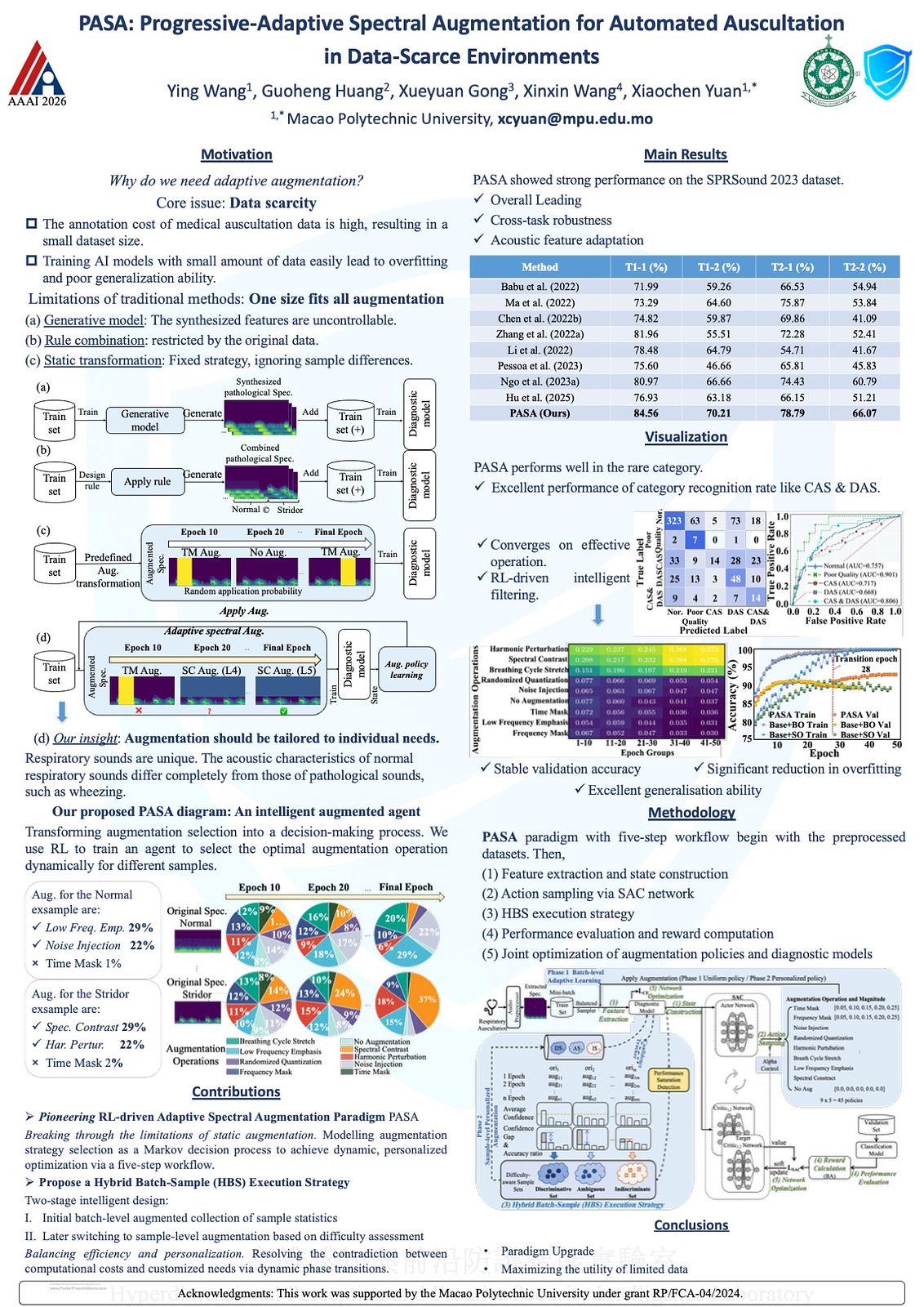 Wang, Ying, Guoheng Huang, Xueyuan Gong, Xinxin Wang, and Xiaochen Yuan. “PASA: Progressive-Adaptive Spectral Augmentation for Automated Auscultation in Data-Scarce Environments.” In Proceedings of the AAAI Conference on Artificial Intelligence, 40:1213–1221, 2026.